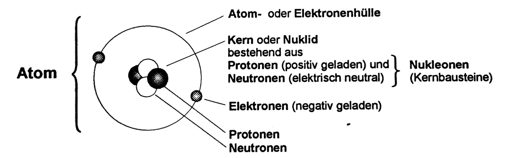 Im Mittelpunkt unserer Betrachtungen steht das Bohrsche Atommodell. Atome stellt man sich als kugelförmige Teilchen vor. Das Zentrum des Atoms bildet der Atomkern, der aus den positiv geladenen Protonen und den neutralen Neutronen besteht. Die Nukleonen (Protonen und Neutronen) tragen fast die gesamte Masse des Atoms. Die Summe aus Neutronen- und Protonenzahl bildet die Nukleonenzahl des Atoms. Die Elektronen bilden die negativ geladene Hülle und bestimmen damit Größe und Form des Atoms.