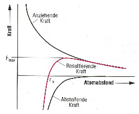 Die Bindungskräfte zwischen den Atomen setzen sich aus Abstoßungskräfte und Anziehungskräfte zusammen. Die Überlagerung dieser beiden Kräfte ergibt bei einem bestimmten Atomabstand \(r_{0}\) ein Kräftegleichgewicht.