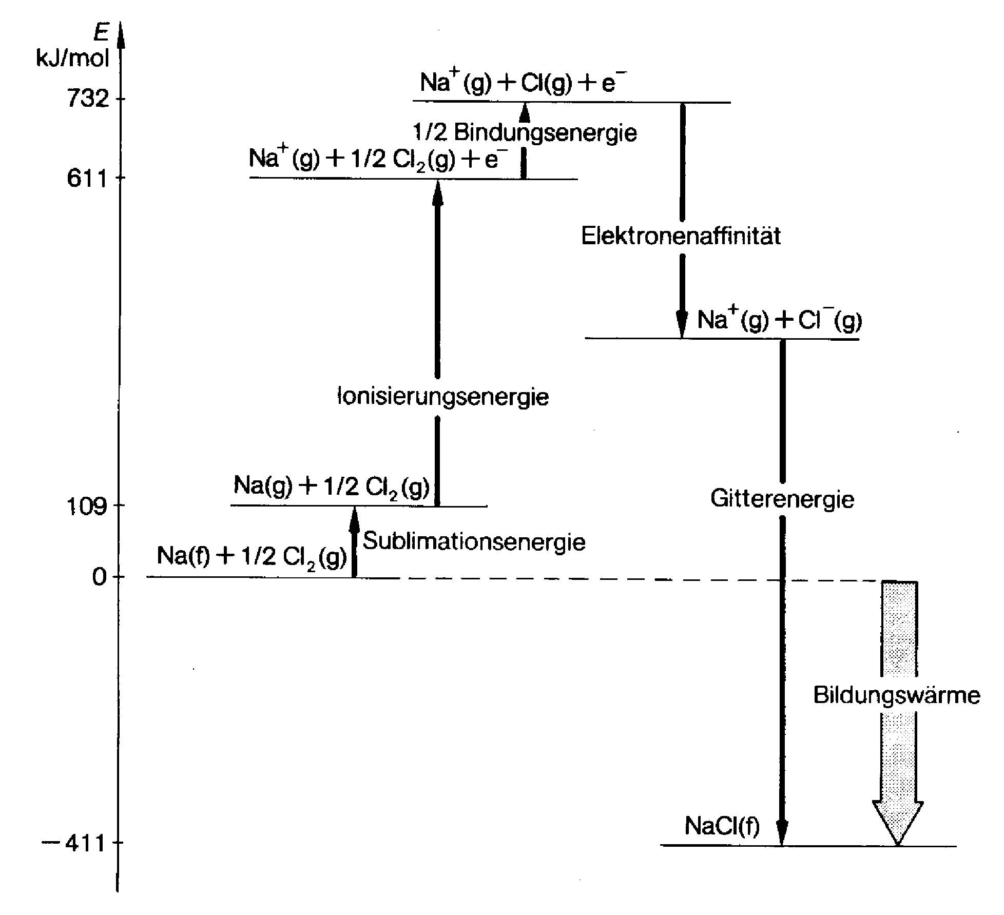 - Gesamtreaktion: \(Na(f)+1/2\,Cl_{2}(g)\rightarrow NaCl(f)\) ; \(\Delta E=-411\,\mathrm{\frac{kJ}{mol}}\)