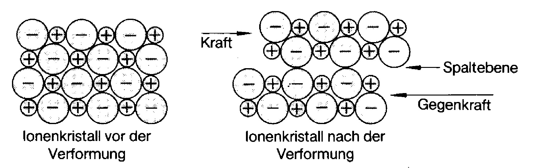 Eine plastische Verformbarkeit ist nicht gegeben, weil bereits bei einer Verschiebung um nur einen Ionenabstand die Anziehung in Abstoßung übergeht. Demzufolge sind diese Stoffe auch sehr hart und spröde. Aufgrund fehlender freier Elektronen sind diese Stoffe schlechte Leiter für Elektrizität und Wärme. Ionenkristalle lassen sich nicht plastisch verformen.