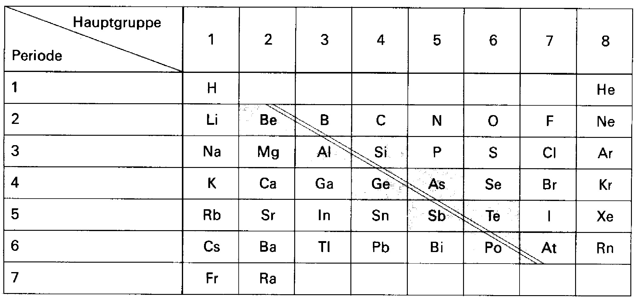 Metalle haben eine geringe Ionisierungsenergie und die äußeren Schalen sind mit wenig Elektronen besetzt. In der Periode nimmt der Metallcharakter von links nach rechts ab. Innerhalb der Gruppe nimmt der Metallcharakter von oben nach unten zu. Die Gerade, die zwischen \(Be\) und \(B\) beginnt und zwischen \(Po\) und \(At\) endet, heißt Metall-Nichtmetall-Trennlinie.
