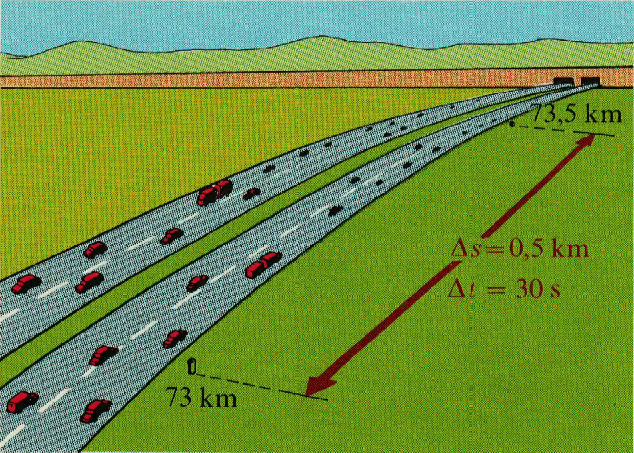 Zur exakten Messung der Bewegung eines Körpers gehört eine laufende Weg- und Zeitmessung. Beispielsweise haben die Autobahnen in Europa am Straßenrand alle \(500\,\mathrm{m}\) eine Markierung. Für einen solchen Wegabschnitt schreibt man: \(\varDelta s=s_{1}-s_{0}=500\,\mathrm{m}\). Ein Auto fährt einen solchen Abschnitt in der Zeit \(\Delta t=t_{1}-t_{0}\) ab. Bei gleichförmiger Fahrt sind die Zeitabschnitte \(\Delta t\) für gleiche Strecken \(\Delta s\) gleich groß.