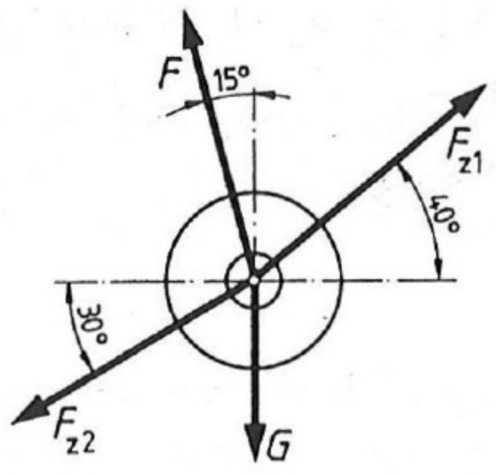 An einer Welle wirken de Zahnradkräfte \(F_{z1}=4500\,\mathrm{N}\), \(F_{z2}=2800\,\mathrm{N}\), die Riemenkraft \(F=2000\,\mathrm{N}\) und die Gewichtskraft \(G=800\,\mathrm{N}\).