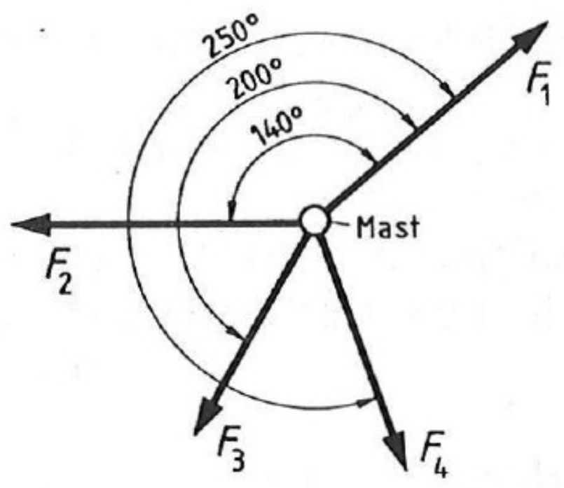 In welche Richtung (\(\alpha\) gegenüber \(F_{1}\)) muss ein fünftes Seil so ziehen, dass der Mast im Gleichgewicht gehalten wird. Welche Spannkraft muss dieses Seil ausüben?
