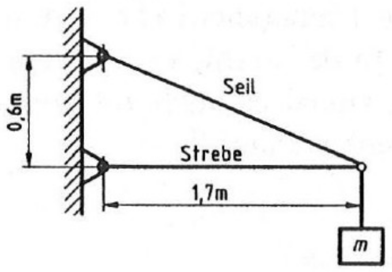 Der abgebildete Wandkran hält ein großes Werkstück, das eine Masse von \(m=750\,\mathrm{kg}\) hat, in einer Höhe von \(10\,\mathrm{m}\) fest. Damit das Werkstück nicht herunterfällt, wirken über das Seil die Kraft \(\vec{F}_{1}\) und über die Strebe die Kraft \(\vec{F}_{2}\) auf das Werkstück.