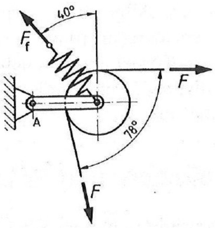 In dem über eine Walze laufenden Schleifband soll eine Spannkraft von \(F=18\,\mathrm{N}\) herrschen. Die Feder wirkt mit der Kraft \(F_{f}\) und das Lager \(A\) wirkt mit der Kraft \(F_{A}\) auf die Walze.