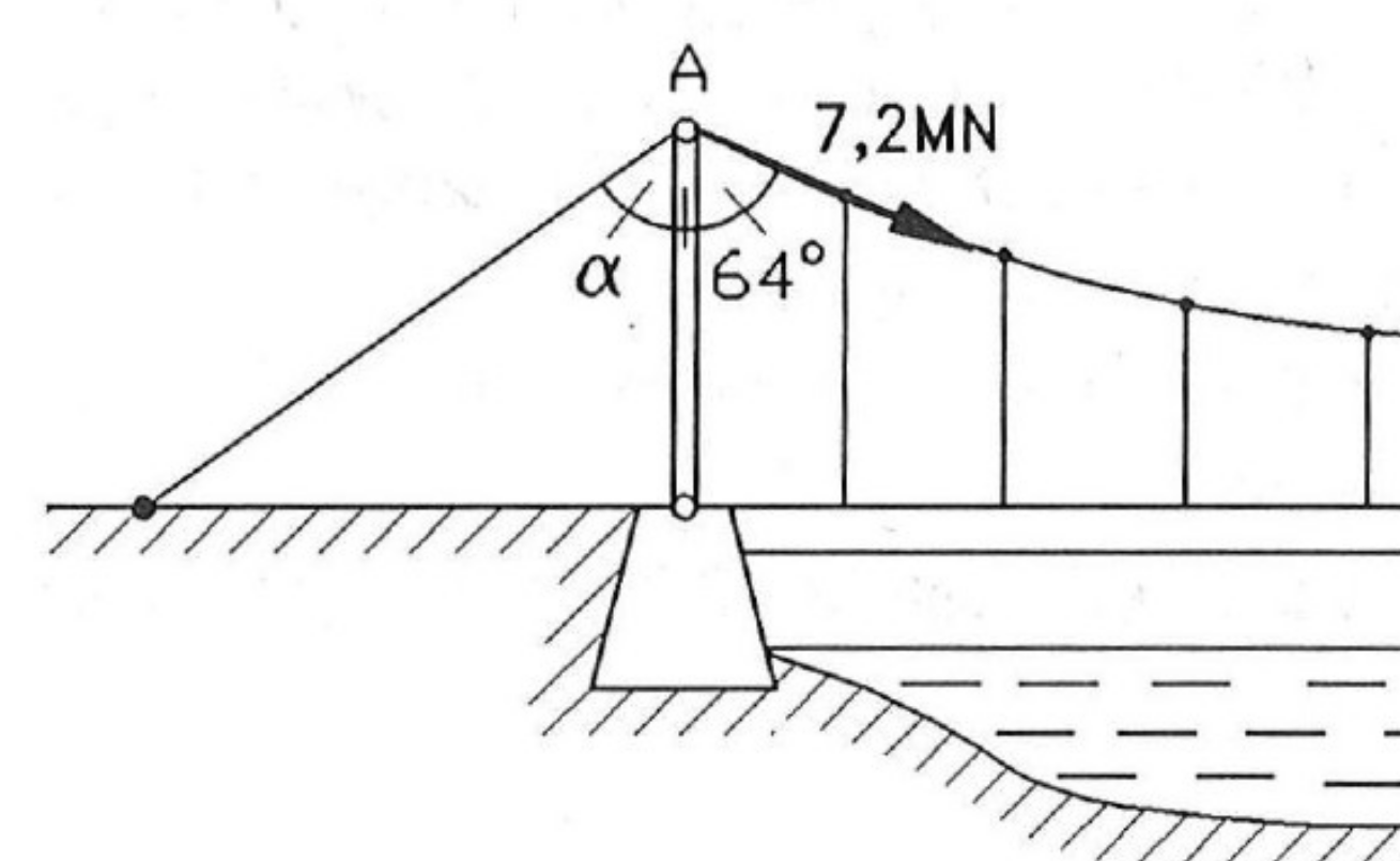 Bei einer Hängebrücke ist die Fahrbahn an einem gespannten Seil aufgehängt. Der Punkt \(A\) ist der Endpunkt einer Pendelstütze, die nur senkrechte Kräfte übertragen kann. Das rechte Seil belastet die Pendelspitze mit einer Kraft von \(F_{1}=7.2\,\mathrm{MN}\) unter einem Winkel von \(64^{\circ}\) gemessen von der Pendelspitze aus. Auf der linken Seite soll ein Abspannseil unter einem Winkel von \(\alpha\) gemessen von der Pendelspitze aus angebracht werden. Das Abspannseil soll die Pendelspitze mit einer Kraft \(F_{2}=80.0\,\mathrm{MN}\) belasten.