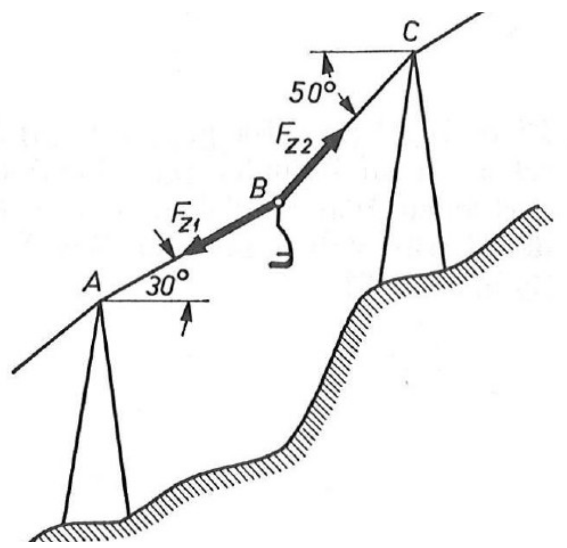 Eine Last mit der Masse \(m=125\,\mathrm{kg}\) hängt im Punkt \(B\) am Tragseil eines Sessellifts, dessen unterer Teil \(AB\) unter \(30^{\circ}\) und dessen oberer Teil \(BC\) unter \(50^{\circ}\) zur Horizontalen geneigt ist.