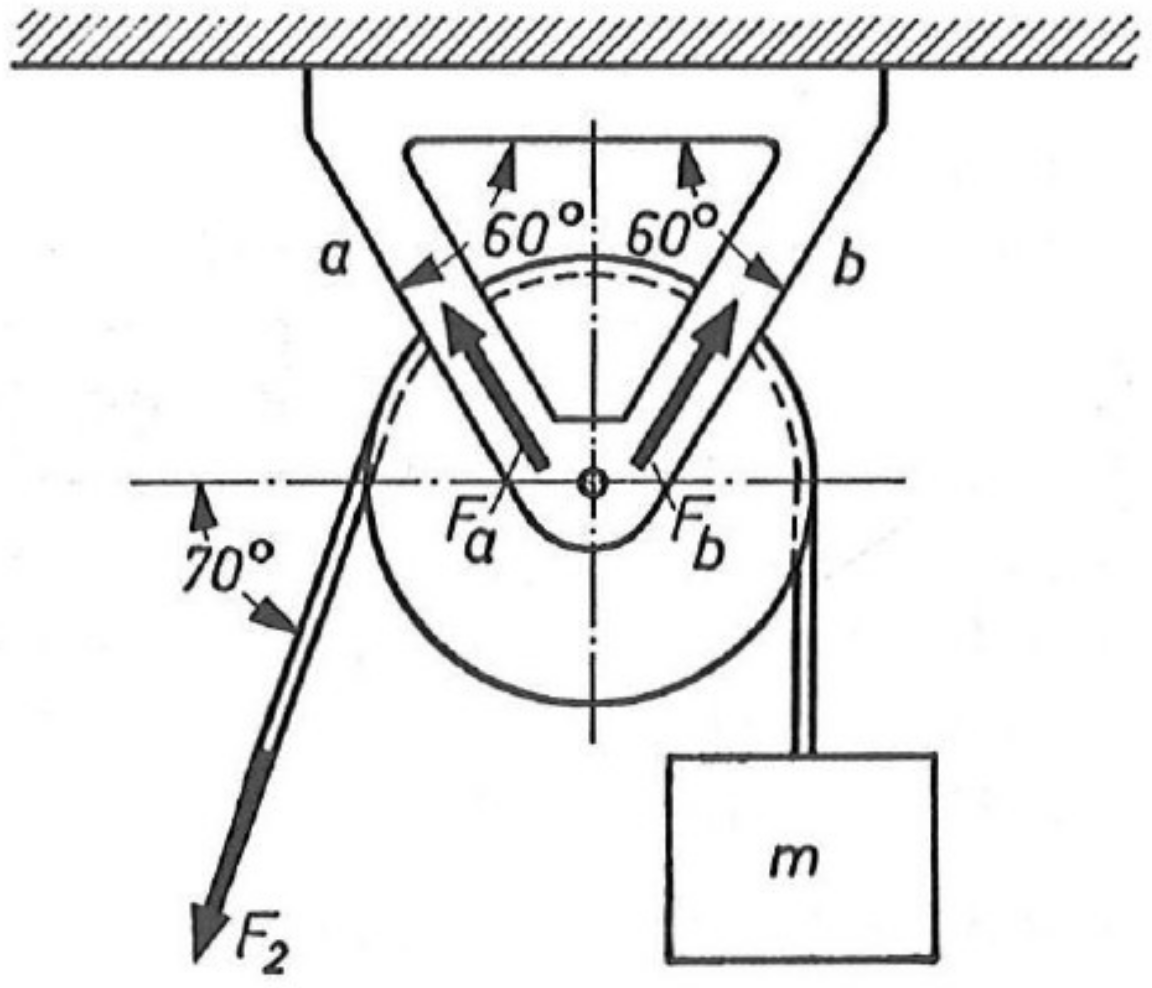 Bestimmen Sie graphisch die Beträge \(F_a\) und \(F_b\) der Kräfte, die in den Teilen \(a\) und \(b\) des Bügels wirken.