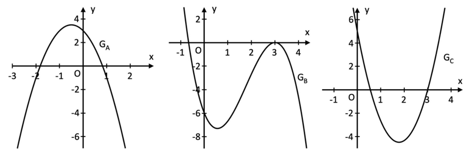 In der nachfolgenden Abbildung sind Ausschnitte der Graphen \(G_{A}\) , \(G_{B}\) und \(G_{C}\) von in ganz \(\mathbb{R}\) definierten Funktionen dargestellt. Entscheiden Sie begründet, welcher der drei Graphen \(G_{A}\) , \(G_{B}\) und \(G_{C}\) zur Ableitungsfunktion von \(k\) gehört. [3]