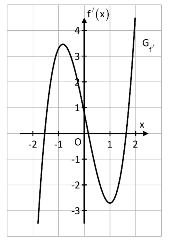 Die folgende Abbildung zeigt einen Ausschnitt des Graphen \(G_{f^{\prime}}\) der Ableitungsfunktion \(f^{\prime}\) einer auf \(\mathbb{R}\) definierten ganzrationalen Funktion \(f\) vierten Grades. Die Funktion \(F\) bezeichnet eine Stammfunktion von \(f\) .